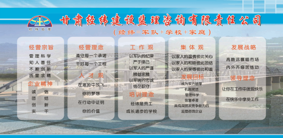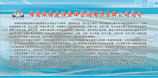 甘肃经纬建设监理咨询有限责任公司成立于1995年,股份制企业、独立法人单位,是甘肃省成立最早的20家监理单位之一。公司在薛明利董事长的带领下,精诚团结,奋发图强,特别是自2003年进行股份置换改制为职工持股以后,员工当家作主,参与管理,公司踏上飞速发展的道路,员工人数、公司业绩连年快速增长,年产值过亿元,成为甘肃监理行业排名靠前的大型监理咨询企业。