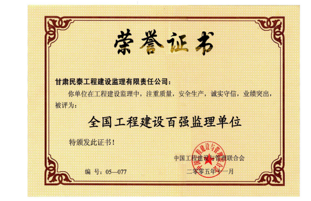公司在业绩创建过程中,已通过ISO国际质量认证,荣获全国首批百强监理企业殊荣。